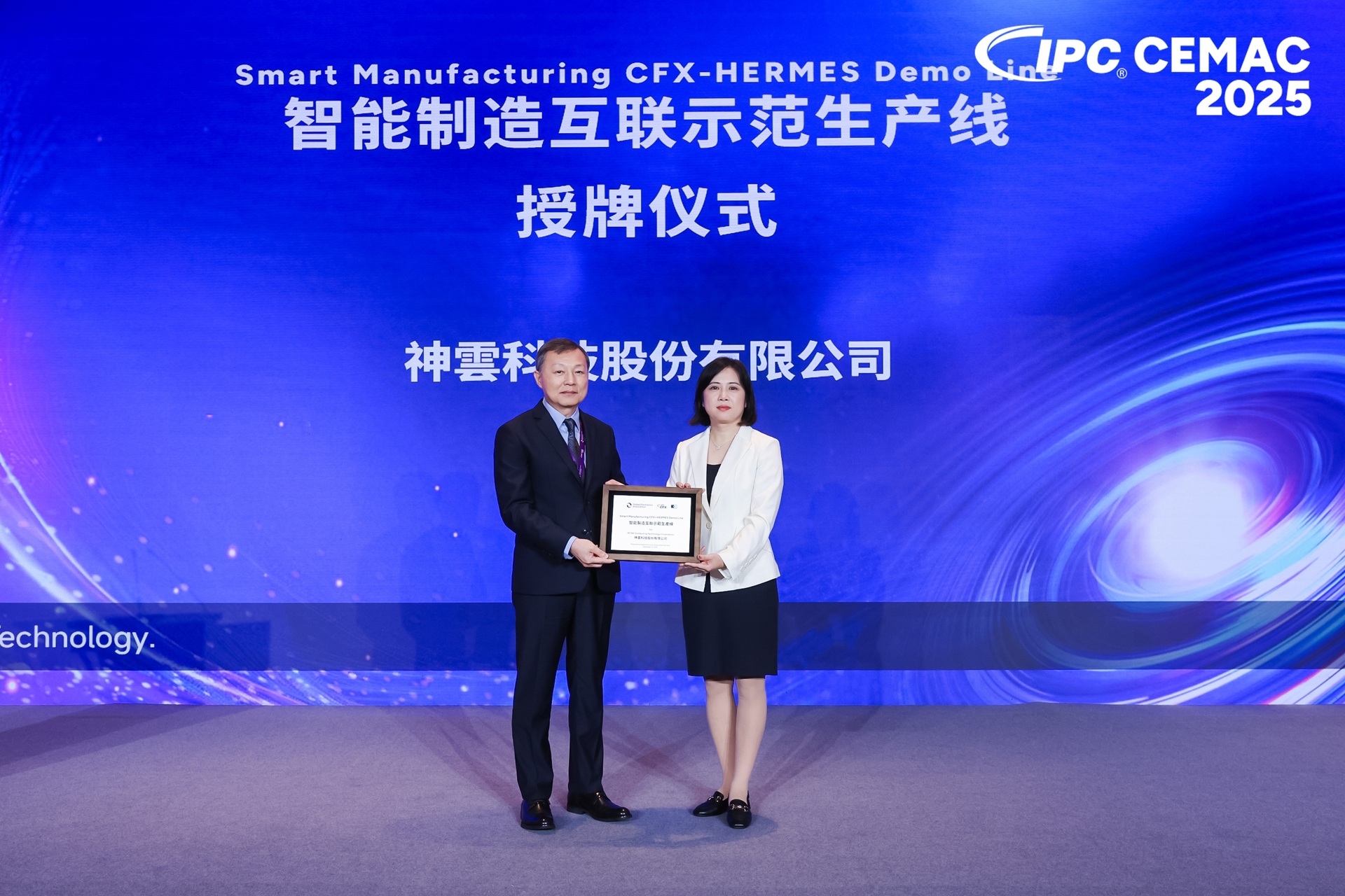 神达电脑股份有限公司与神云科技股份有限公司动建设的 SMT 生产线,因全面导入IPC-CFX与IPC-HERMES-9852标准,获颁“智能制造互联示范生产线”荣誉。